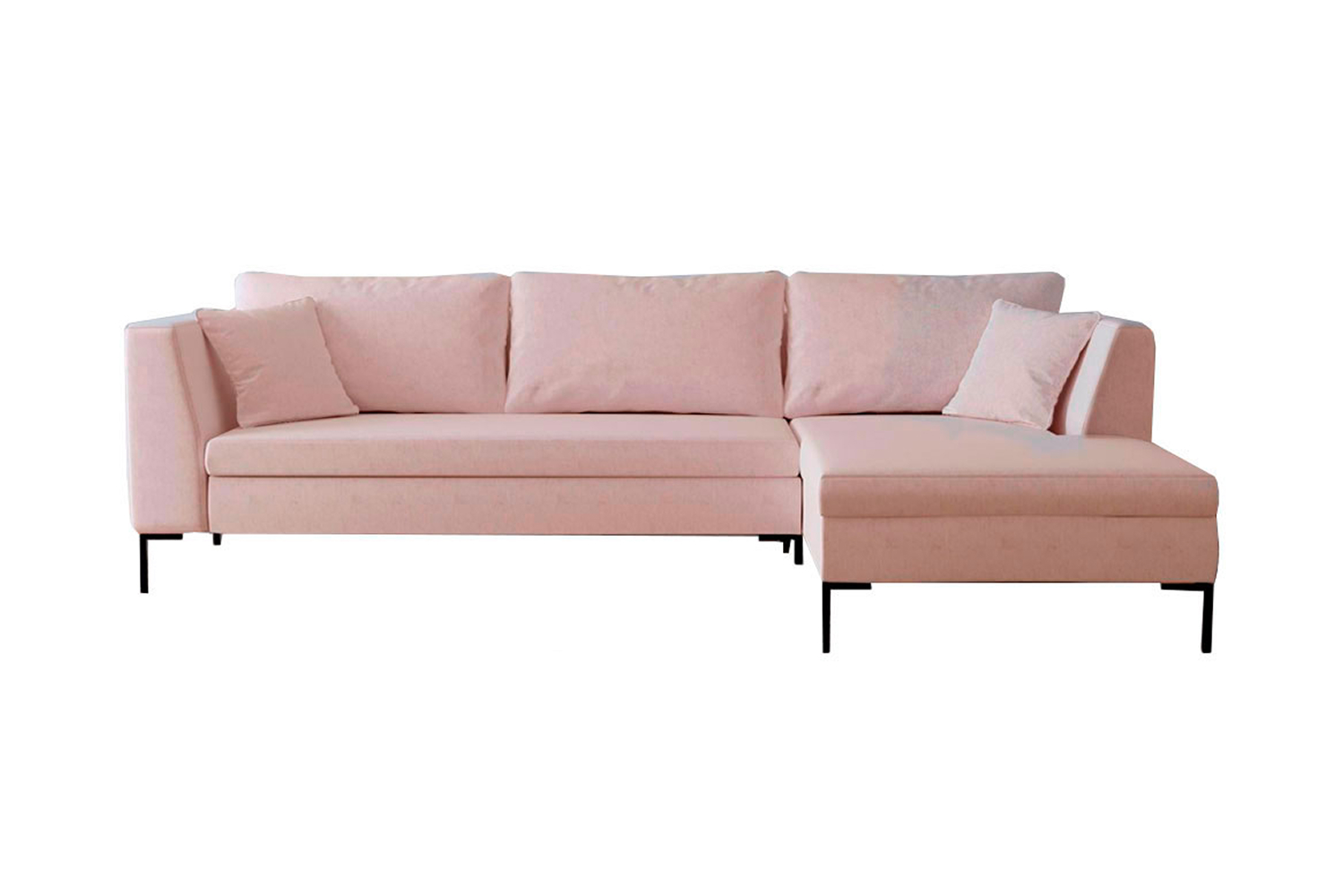 Нежно-розовый оттенок обивки визуально облегчает конструкцию «Челси», делает модель невесомой, воздушной, словно парящей в воздухе. Этот эффект подчеркивают контрастные тонкие ножки из окрашенного в черный цвет металла. Угловая модель станет полноценным украшением современного интерьера, обстановки в стиле сканди или модерн, облагородит помещение в светлых тонах и оживит слишком приглушенный дизайн.
